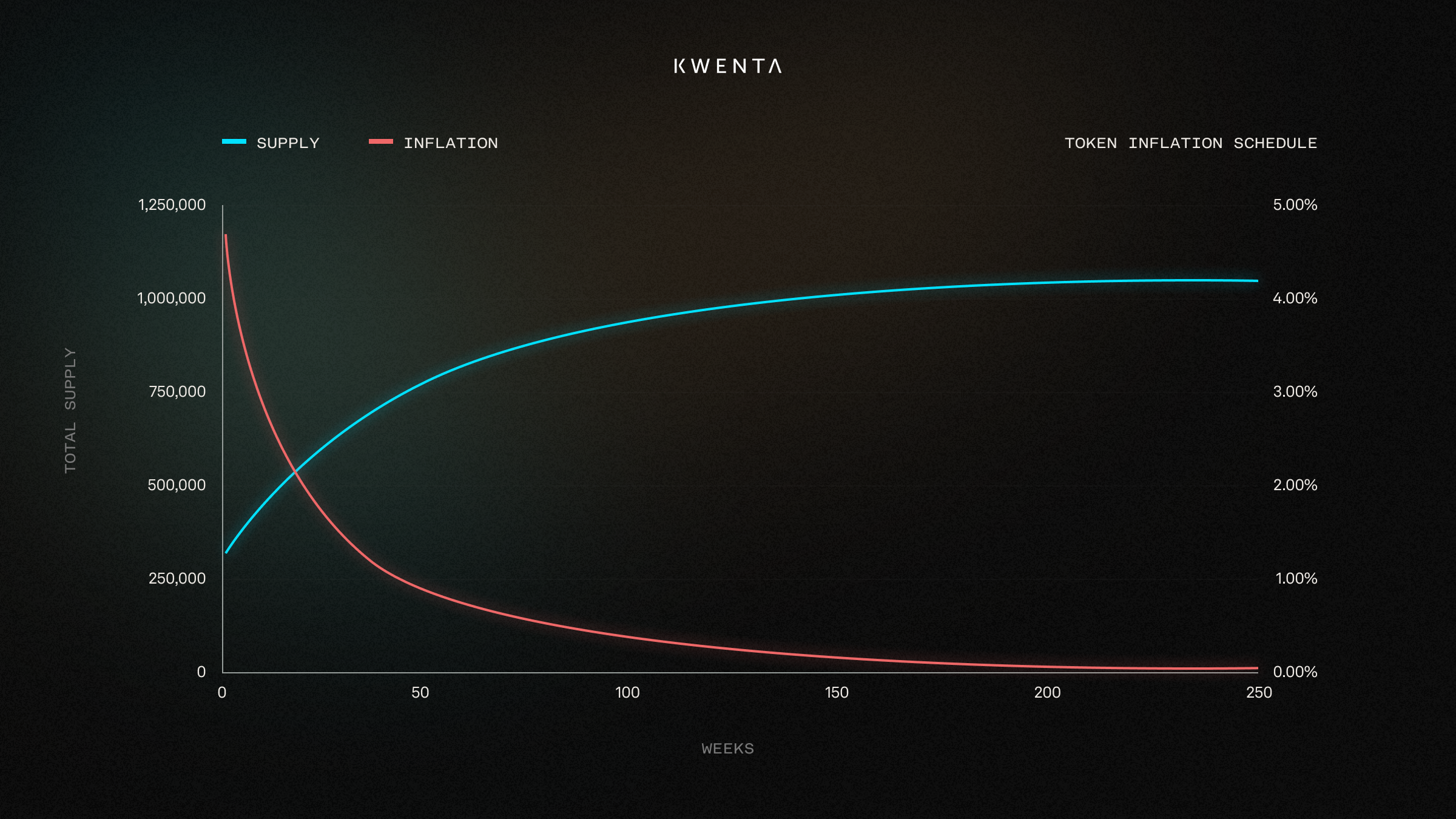 KWENTA will have an initial supply of 313,373. Weekly emissions will start at 14,463.37 $KWENTA the first week and drop to around 200 $KWENTA (1% APY) at the end of four years. Resulting in a total supply at the end of four years of 1,009,409.43.