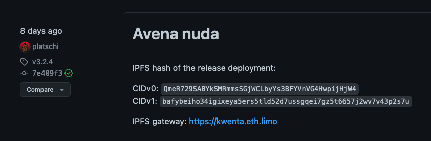 To fully verify that the IPFS hash relates to the release shown on GitHub, you can also verify the commit hash by double checking the commit hash shown on the release (see left sidebar of the screenshot) with the latest git hash printed on any page on Kwenta at the very bottom: