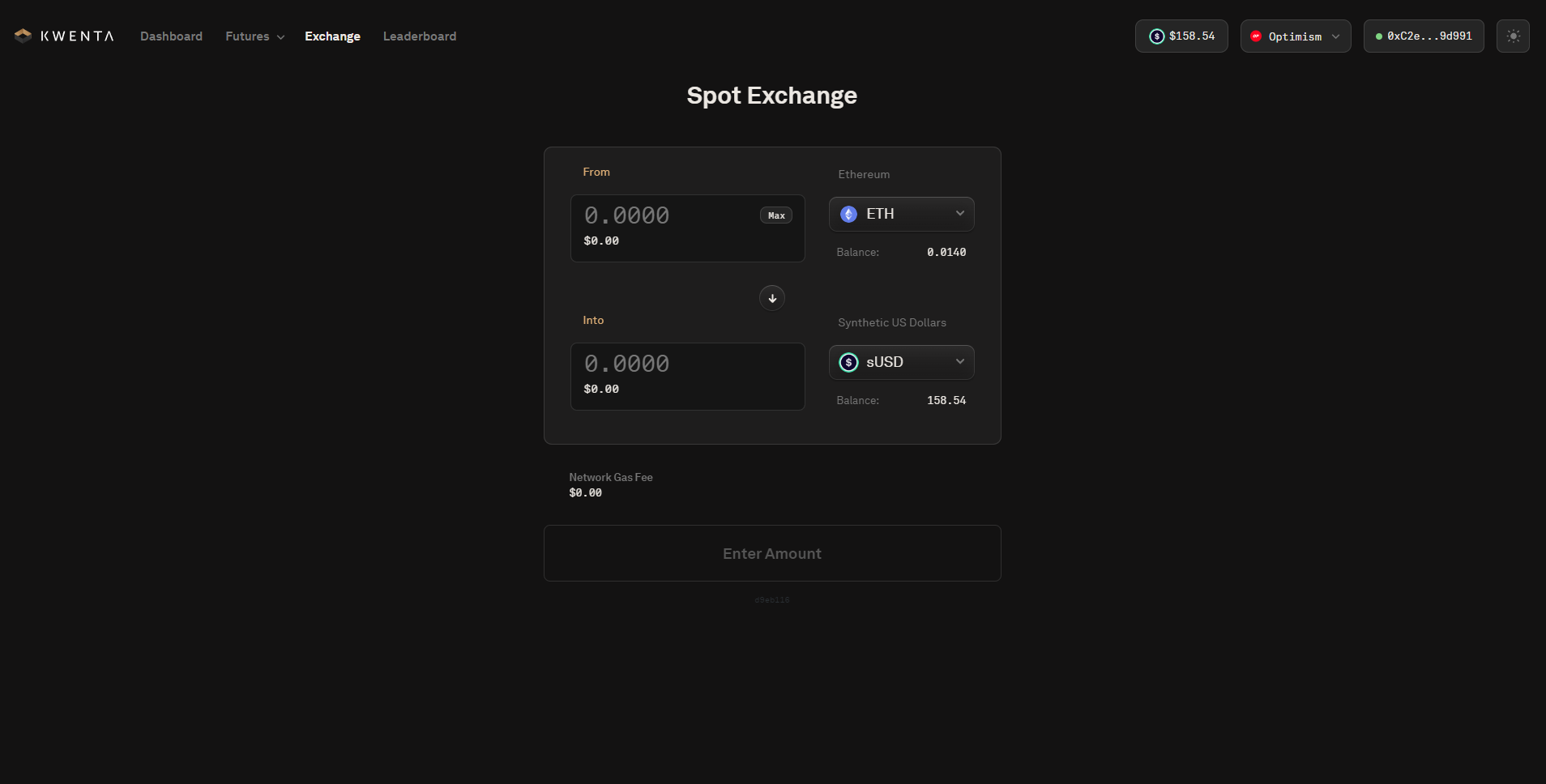 First, head over to [Kwenta Exchange](https://kwenta.eth.limo/exchange/).