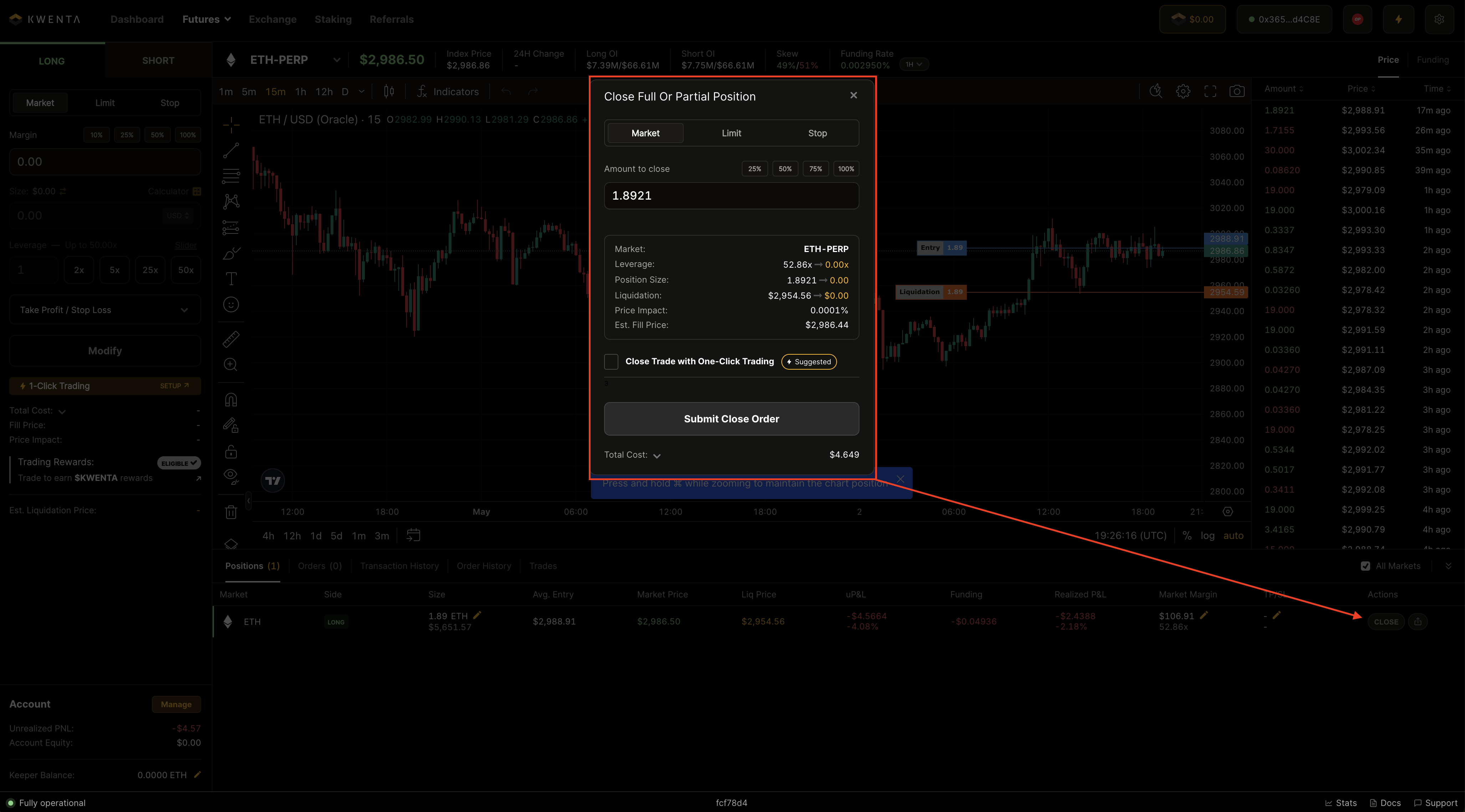 Closing an open position if all margin is exhausted or the trader doesn't have enough margin to reserve to execute the trade, the close has to be done through the `close position` modal by selecting `close` on the positions table on an open position.