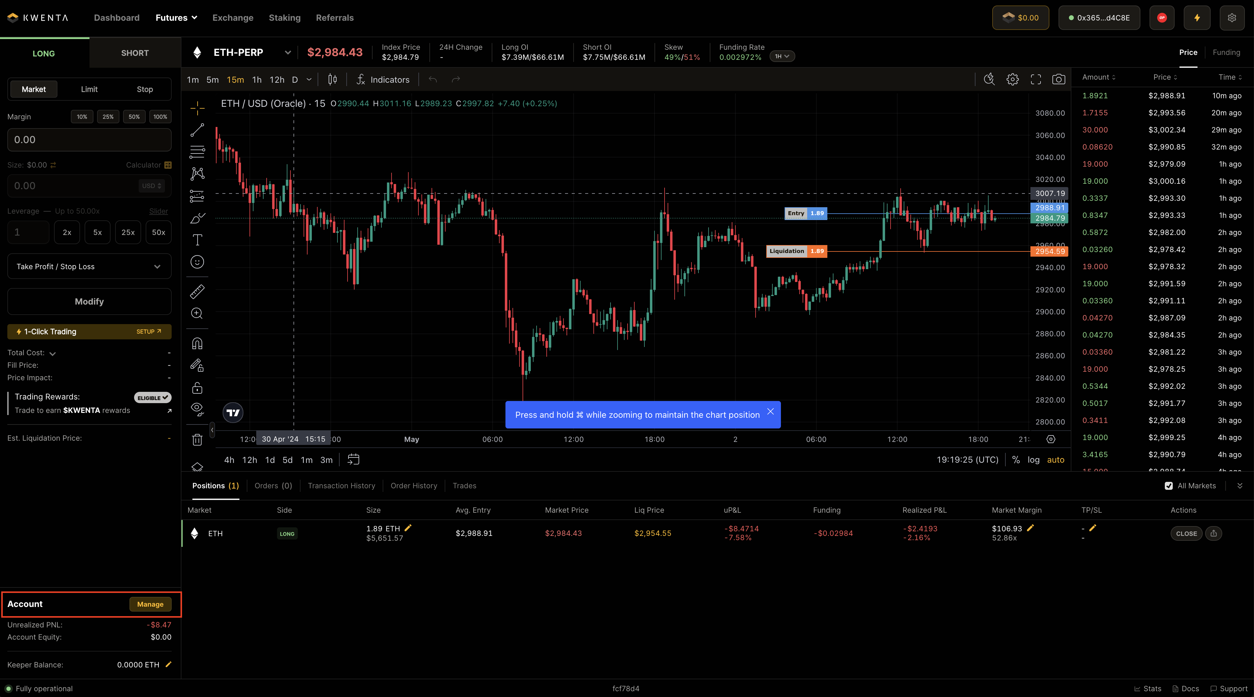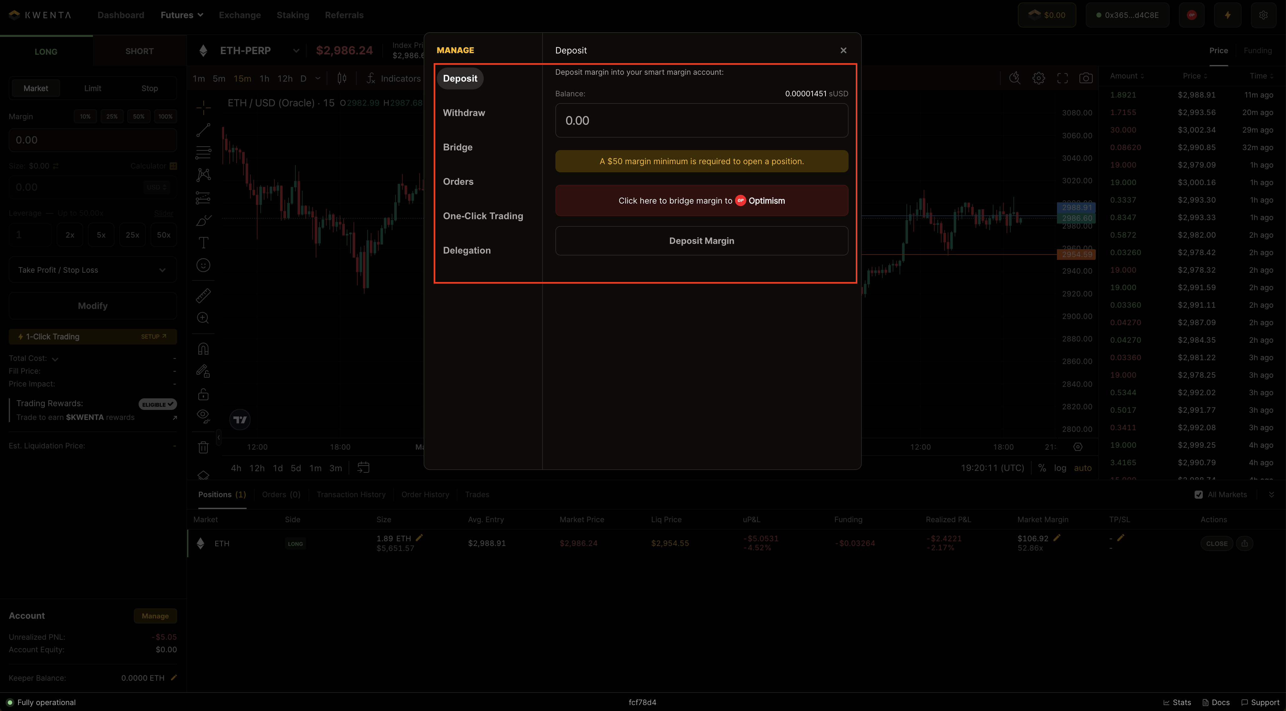 Once you've selected your margin type & make sure the correct wallet is connected, you can easily withdraw funds in your smart margin wallet by selecting Manage in the order entry panel.